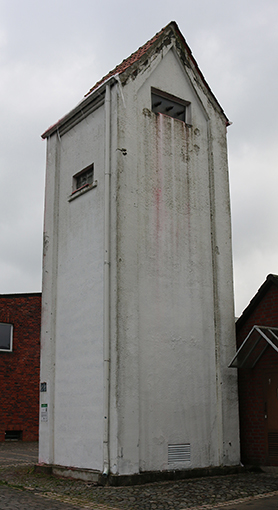 For this piece i blocked the rain water downpipes with a kork and filled 5 liters of red pigment in the water gutter. Then i waited for the rain. After the first rain nothing happened. The water gutter was not enough filled with water. By the second rain the water was mixed with the pigment and runs over the water gutter and flowed over the facade subtle. Now i waiting for the next rain.